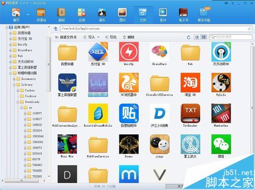 3、将设备于电脑连接打开同步助手。在“文件”、“应用(用户)”中找到bililbili客户端并双击打开