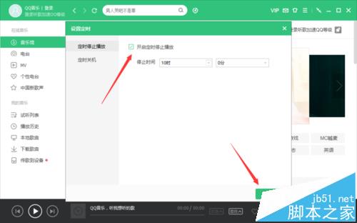 6、在定时停止播放选项的右侧窗格中,勾选“开启定时停止播放”选项,设置需要定时停止播放的时间,再点击“确定”按钮即可。如图所示;