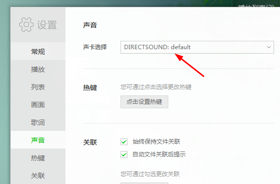 4、在设置的界面点击声音,可以看到声卡选择,这里的选择默认的DIRECTSOUND;default,如图所示