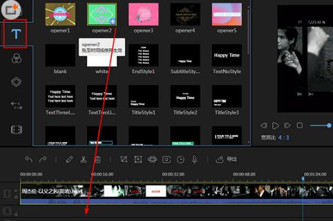 2、软件默认处于“素材”的窗口栏,用户需要点击红框标注内的“文字”选项找到相关字幕的各种样式,大家可以点击某个素材字幕上的“+”号选项,也可以将字幕拖动到下方的时间线上,这两种方法都是可以添加字幕的,如下图所示: