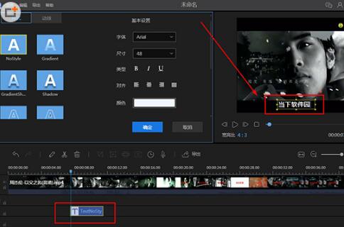 3、添加完成字幕后,当然是要对字幕本身的内容进行编辑啦,由于一段视频中可能会需要多个字幕,所以为了防止选中错误时间点的字幕,用户可以点击下方时间线中的时间,将整个时间线进行放大,接着双击字幕内容,在基本设置中选择字幕的字体、尺寸与类型等内容,接着在播放窗口中修改字幕本身的文字,如下图所示: