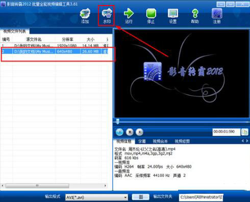 2、选中水印以及字幕文件,点击上方的“删除”选项即可轻松去除之前已经编辑添加好的水印以及字幕;此方法是专门针对用户亲手在影音转霸2012中添加过的水印与字幕,如果你想要将源视频中自带的水印、字幕内容进行清除,请继续往下看,如下图所示: