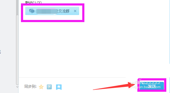 6、点击此群后,此群的名称就出现在右侧的空白处,如果选择好友,好友的昵称就会出现在这里,然后点击右下角的"发送”。