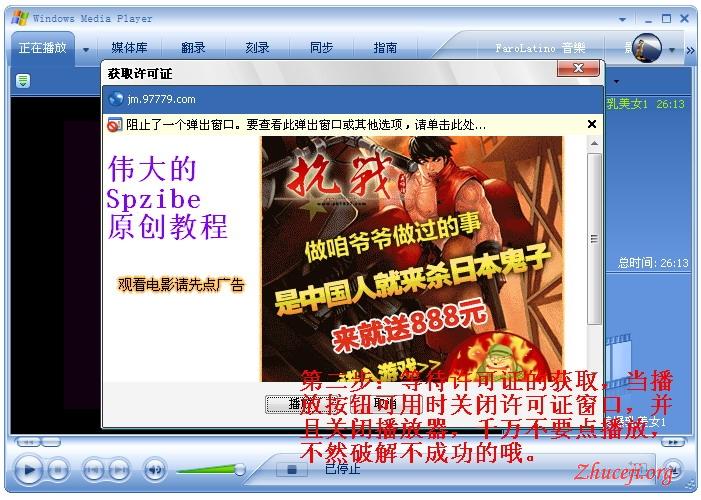 我用的IE7和Windows Media Player 10播放WMV文件,从来没弹过如大家所说的广告病毒之类的东西。 首先Windows Media Player 10必须安装有!这个是播放的前提条件!那么会有人问其他播放软件可以吗?可以,暴风影音3。大家也许又会问到:“为什么要用这个中其中一个来播放呢”?原因很简单,因为用它们播放可以弹出获取播放许可证的窗口!注意:我所推荐大家用的是Windows Media Player 10 .千万不要用10以上的版本!因为可能破解软件还没有那个能力向上支持! 以上我说的那些提醒大家注意,别当废话!不然破解不成功不要问我!图解教程开始,图上也有文字说明,下面我就不多说了,大家看图吧