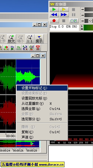 3.截取声音.有了整段视频的声音,我们就要在里面选取我们喜欢的,这时就需要GoldWave出场了.我们可以用GoldWave把视频中我们需要的声音截取出来.以酷睿广告的最后一段声音为例,用鼠标的右键确认开始和结束的部分就可以了.如果无法精确定位,可以使用右边"控制器"的黄色按钮把选定部分多听几遍.