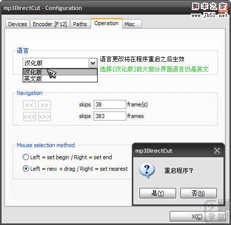 您可以选择原始英文界面或者汉化的简体中文界面,如果由默认的英文界面切换至简体中文界面,程序将提示您重启本软件以使更改生效,此时请点击[是]。