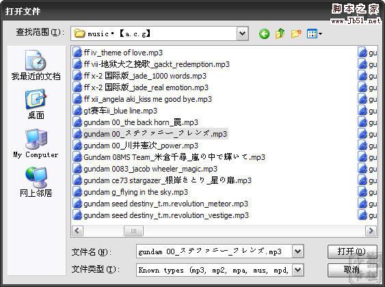 首先点击[文件]菜单下的[打开]菜单项,打开用于制作手机铃声的源文件。本软件的输入格式支持MP3、MP2、MPA、MUS、CUE(Cue Sheet)等,由配图的“打开文件”对话框可以看出本软件对中日韩等东亚语系的双字节字符支持良好。