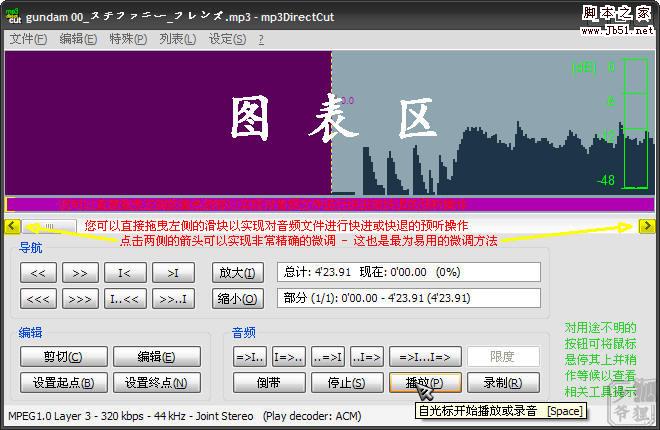 软件主界面下半部分由导航区(定位切点)、音频区(预听歌曲)、编辑区(常用操作)等区域构成。其中导航区的使用相对复杂,而对于一般需求的手机铃声制作而言,导航区是使用频度最低的区域,因此笔者并不推荐在此进行操作,而是演示一种避繁就简的、“最速”的方式 – 点击五、六次菜单或按钮便完成手机铃声制作的流程。