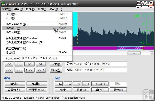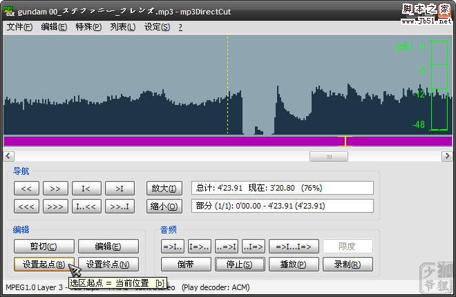 mp3DirectCut 汉化版制作手机铃声/提取音频的基本过程实际上只需要三步:预听歌曲、确定选区、保存切段。打开待处理的源文件后,请点击音频区的[播放]按钮开始预听。预听时可以看到图表区中的分贝计量器波形图将随着歌曲的播放而发生相应的变化,对此我们不必过分留意。需要注意的是导航区上面的滑块与双向箭头,由于预听是随用户对这些控件的操作实时变化的,因此熟悉对这些控件的使用之后,我们可以很方便的进行快进、快退,以及后续操作中可能会涉及到的选区微调。