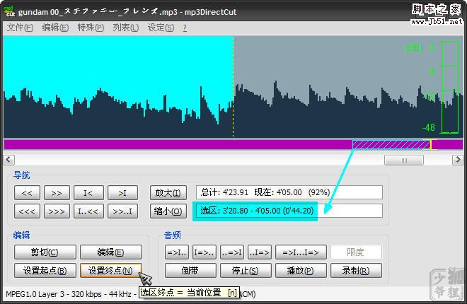 然后再继续预听并通过定位控件定位到歌曲的高潮部分结束处,按下编辑区的[设置终点]按钮确定选区终点。此步骤由导航区的信息框可以明确选区起点、终点的起、止时间,以及整个选区的持续时间。