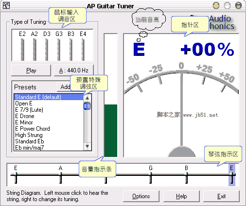 左侧中部为“预置特殊调弦区”。在我们实际演奏中有时候为了演奏或者演唱的方便往往需要对吉他进行非常规的特殊定音。为此,在这里软件提供了多种特殊定音类型供用户选择。网上有许多对该软件的介绍都说AP Guitaar tuner“可播放多种和弦”,其实就是对该区功能的误解,当我们在这个框架中选择一种调弦类型,按上方的“Play”按钮可以听到声音,但是这并不是各种和弦的试听,而是当前所选特殊调弦类型的六根弦的空弦音。注意:如果不想使用这些类型就要选择该框架中最上方的“Standard E”即可进行默认的常规定音,即E B G D A E的调弦方式。