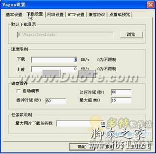 2)下载设置:“默认下载目录”是自选下载文件的存放位置,默认的是存放于Downloads下。(注意:有下载任务,特别是当前正在续传时,请不要随意修改此选项。)“速度限制”用于限速,但只是一个大体范围没有严格限制,所以如果你看到实际的数值超过了你的设定不要奇怪。“磁盘缓存”默认的是点选“自动调节”而其它几个框是灰色的不能填数(建议初级用户使用默认的自动调节)。“任务数限制”是指同时让几个文件下载,超出的会自动“队列中”排列等待(建议少一些,根据自身情况合理设置)(如图11所示)。