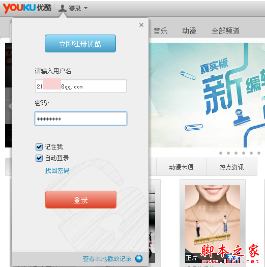 4、再回到优酷客户端,输入刚才注册的用户名邮箱及密码,登陆。(如果电脑不是自己的,就请不要保存记住和自动登陆)