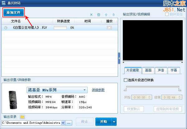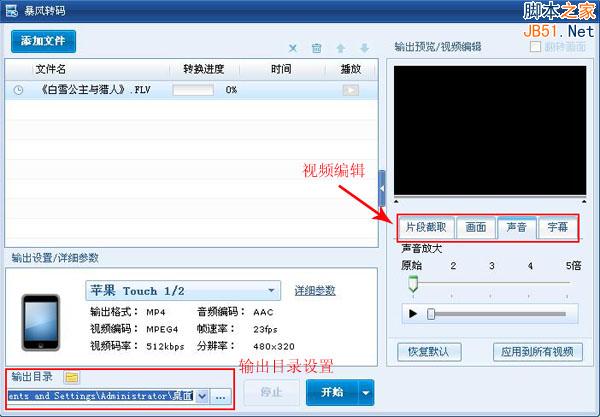 格式选择完成之后,回到软件主界面,在软件的右边具有视频编辑功能,其中包括,视频截取、画面裁切、声音缩放及添加字幕等几项功能。不需要的朋友,可直接设置文件的输出目录。