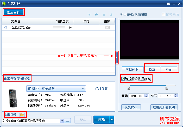 暴风工具箱中的“暴风转码”中实现;将文件添加后,按照操作提示一步一步设置即可,视频截取目前必须通过转码来实现;(如图)