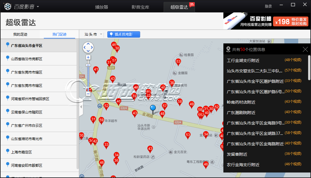 4、热门足迹中记录的是使用超级雷达这个功能最多的用户地区,并记录了该地区用户正在观看的视频。我们可以通过选择左边的地区名来选择查看当前地区的用户正在观看的视频。
