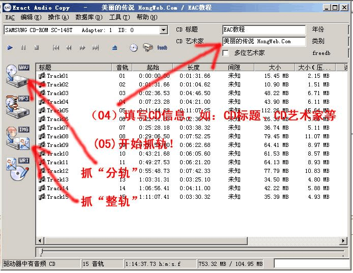 注解:整轨方式要比分轨方式好,抓成整轨,随时可以利用CUE列表,生成分轨歌曲文件,同时在刻录CD的时候,整轨方式保留的原CD光盘歌曲之间的间隙(原滋原味);所以建议大家抓轨的时候抓成整轨。