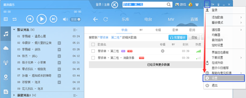 1、点击以上网址,下载安装“酷狗音乐”选择“菜单设置”按钮。如图所示: