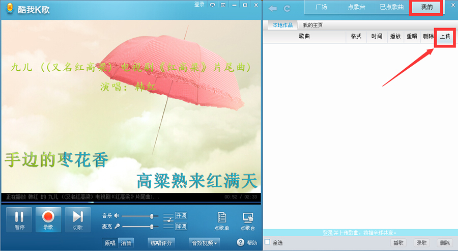 6.上传:您在保存完成歌曲后会自动弹出上传框口,若您录制的是独唱,那么选择独唱上传;若您录制的要与他人合唱的歌曲,请选择发起合唱
