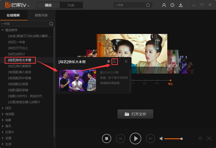 1.在脚本之家下载安装芒果tv客户端最新版,打开后选择要下载的视频,小编以快乐大本营为例。鼠标点击后右边会弹出一个框,然后再点星星右边的下载按钮。