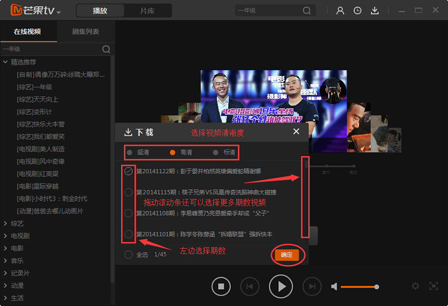 2.然后再选择要下载的期数以及清楚程度(有超清、高清、标清),最后点确定即可。