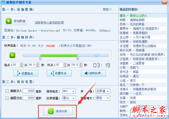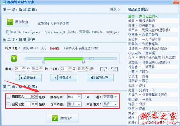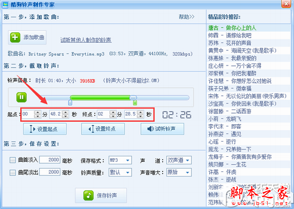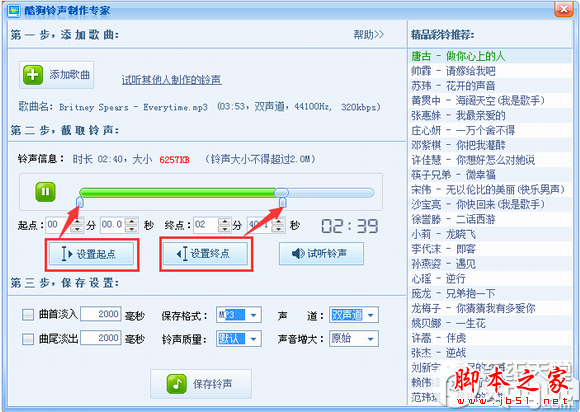 2.进入铃声制作页面,就可以发挥你的所长了,跟很多的音乐编辑工具差不多。最重要的设置开始和结束时间,可以鼠标点击,也可以设定时间。同时还有其他很多设置,我就不一一介绍,你可以去自己尝试就可以了。同时,还可以试听。如图。