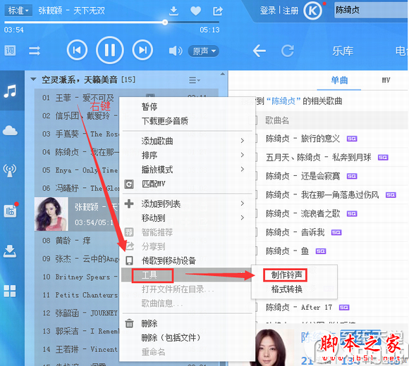 1.打开酷狗,选择你的音乐,选中你要编辑的音乐,然后右键,下来菜单,点击工具——》制作铃声,