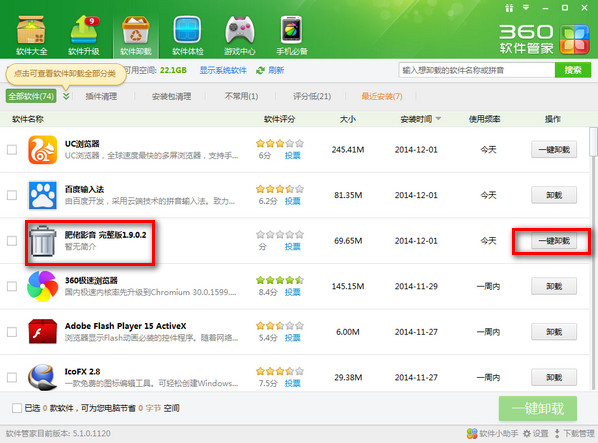 找到肥佬影音,点击一键卸载,即可将软件卸载得干干净净