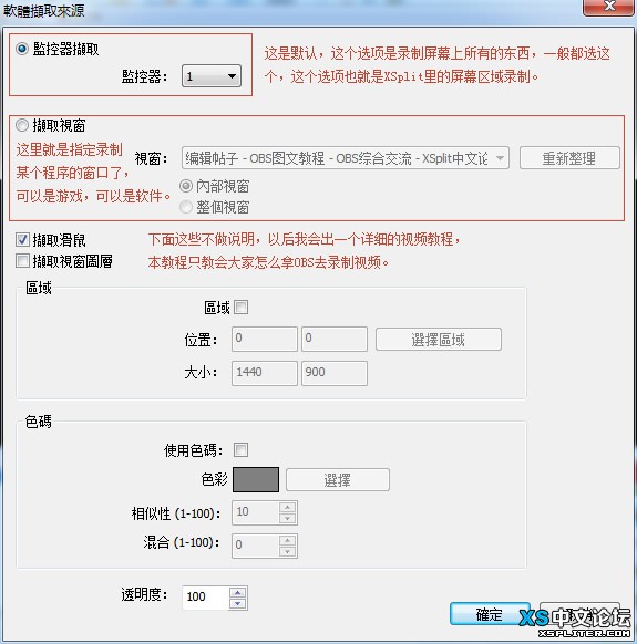 3)看一下上面的图片注释,默认即可点击确定,就可以添加屏幕录制区域了。