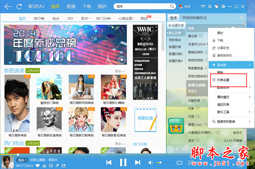 2、接着,切换到你的音乐列表中,右击列表,选择“列表去重”这样列表中重复的歌曲就不存在了。