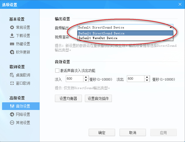 酷狗的设置里面有个选项---音频设置---选择合适的设备即可