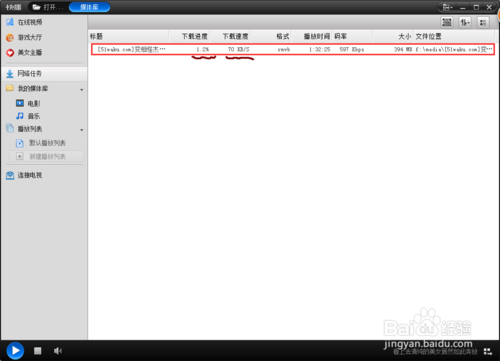 6、这不,缓冲一会儿后,网页上的电影已经开始播放了。再点击播放器的网络任务,是不是已经在下载啦。咯咯,酷酷再告诉你一点,按我这样做,以前快播能播放的任何东西,现在一样能全部播放。