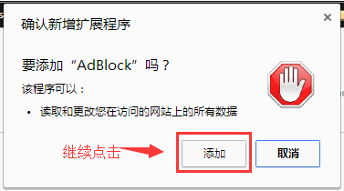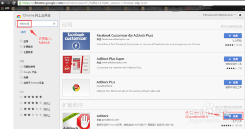 在应用商店的页面的左上方输入"AdBlock",按回车键后就可以看到Adblock插件出现在右边的栏目,再点击"+免费",就会弹出一个对话窗口,点击"添加"就会开始加载这个插件了!
