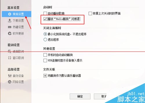 4、在“常规设置”里面,可以看到有一个“播放hello酷狗问候语”前面的复选框是默认打勾的。我们需要做的是将复选框中的勾选去掉。