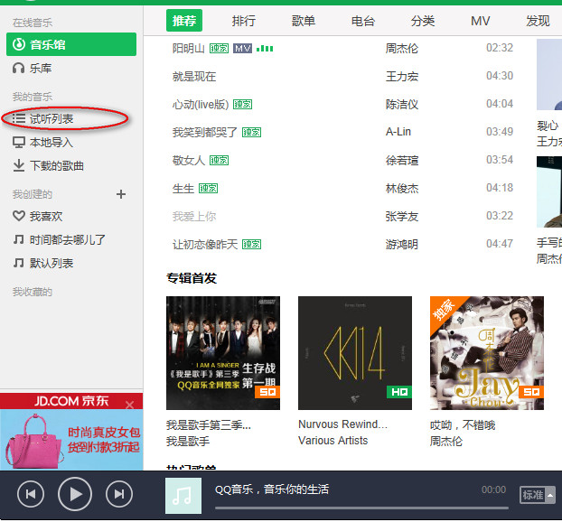 1、我们首先打开QQ音乐,点击试听列表,小编使用的最新版的QQ音乐不知道大家是不是,如果不是大家可以更新哦