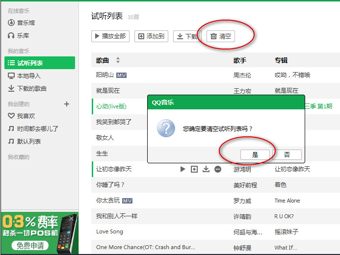 2、我们可以看到试听列表中有一个"清空"按钮,点击一下就可以清空了。在弹出的对话框中选择“是”