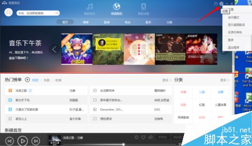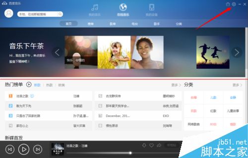 1、打开电脑版的百度音乐播放器,点击右上角一个齿轮状的图标,即“设置”图标。