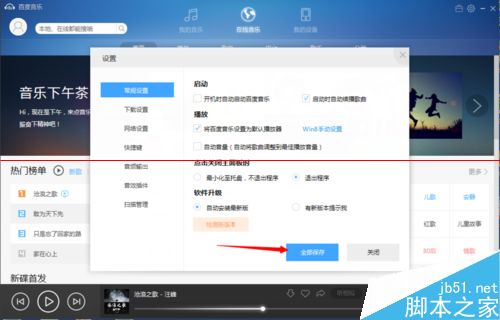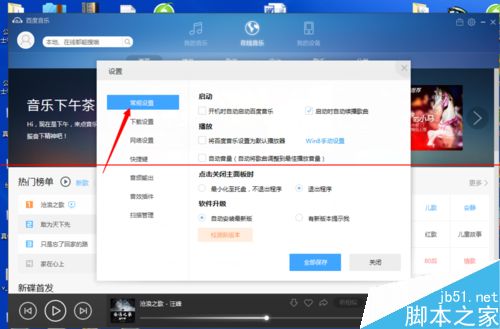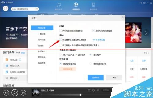 4、在”常规设置“项目下,有一个”播放“项,其中第一个就是”将百度音乐设置为默认播放器“,现在前面的方框内是空白的。在方框内打上勾。