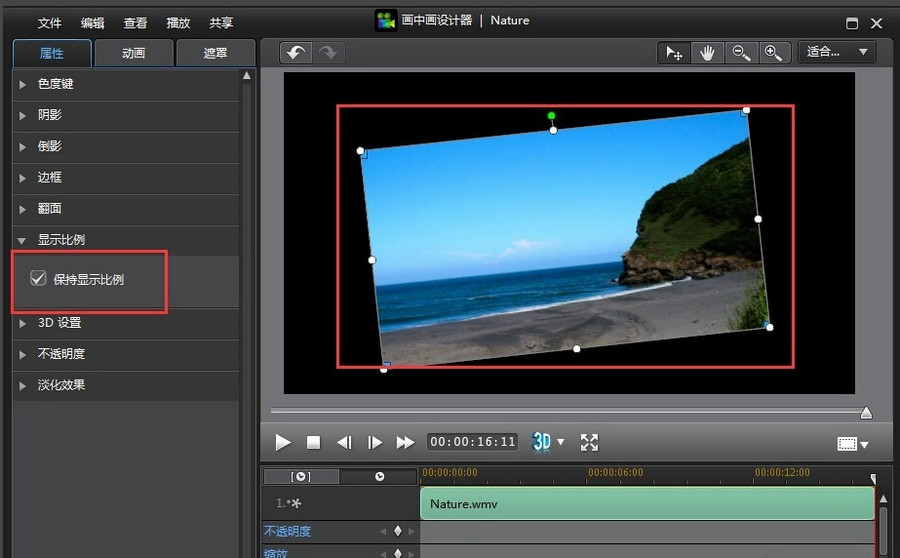 2、在弹出的的属性框,把显示比例勾选上,把视频画面等比例缩小。