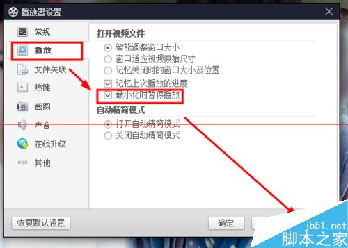 3、在【播放器设置】界面下,点击选择【播放】-->勾选【最小化时暂停播放】-->【应用】选项完成操作。(如图所示)