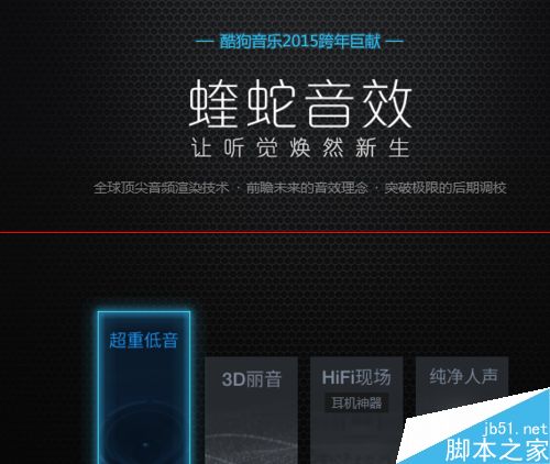 1、蝰蛇音效,就是将我们听到的歌曲经过后期调校,然后以精湛的音乐渲染技术还原出歌曲的魅力。目前,酷狗音乐蝰蛇音效有超重低音、3D丽音、HIFI现场和纯净人声这四种
