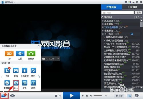 2、打开刚刚安装的“暴风影音”,单机右下角的“工具箱”图标,然后单机里面的“dlna”。(这一步之前就可以打开电视,并且开启电视的DLNA功能了)。