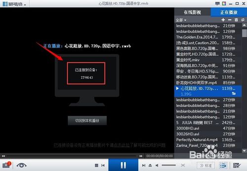 4、连接成功后,我们打开播放列表,随便打开一部本地或者在线的视频,视频就会被投到dlna设备上播放。如果要切换到电脑上播放,单机暴风影音中的“切回到本机播放”。