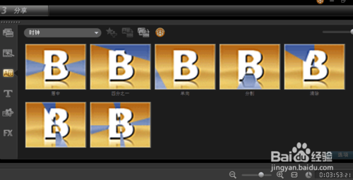 2、点击转场按钮---收藏夹---时钟,然后选择第一个时钟效果