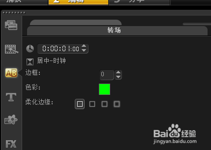 4、改变切换效果时间长度:用鼠标双击视频轨道上两个图片之间的转场,会出现一个面板,如图示,点击面板上面的时间按钮可以改变切换效果的时间长短。
