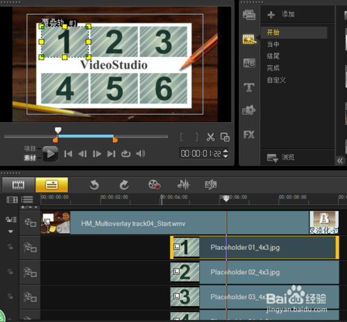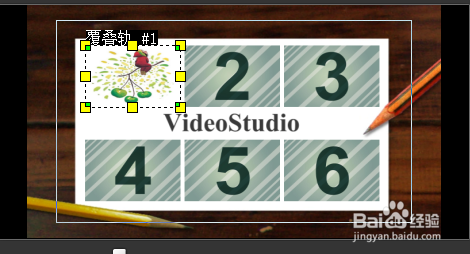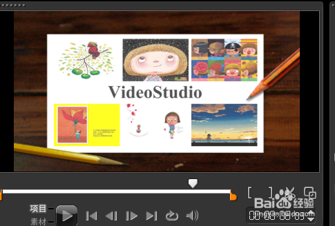 4、替换图片素材之后,替换标题素材。步骤:单击选中轨道上的文字标题,同时去点击画面上面的文字video studio,要双击使其改变成自己喜欢的文字。我这里变成了“郝完美”。如图