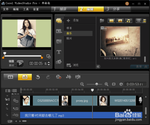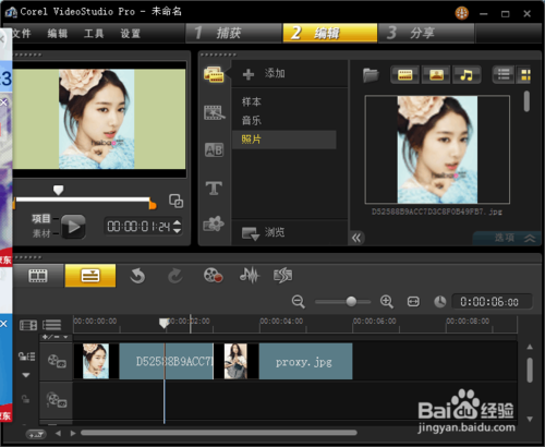 5、根据这些方法,一个简单的视频雏形做好了。当然丰富视频的效果还可以添加艺术字,转场,滤镜。当然还可以用ps修饰图片或者视频,使内容更为丰富