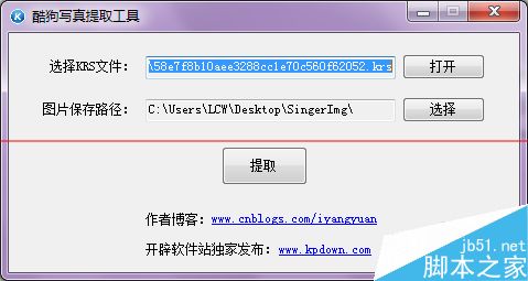 5、在选择KRS文件里选择歌手的KRS文件(如C:\Users\LCW\AppData\Roaming\KuGou8\SingerImg\58e7f8b10aee3288cc1e70c560f62052.krs)。图片保存路径里选择写真图片提取后的保存路径(如C:\Users\LCW\Desktop\SingerImg\)。最后点提取。出现提取成功后,表明提取成功了。