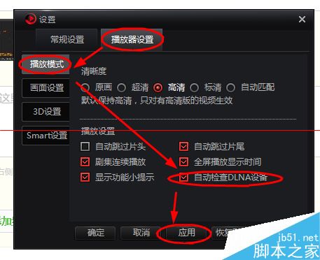 3、在【设置】界面下,点击选择【播放器设置】-->【播放模式】-->勾选【自动检查DLNA设置】-->【应用】选项完成操作。(如图所示)