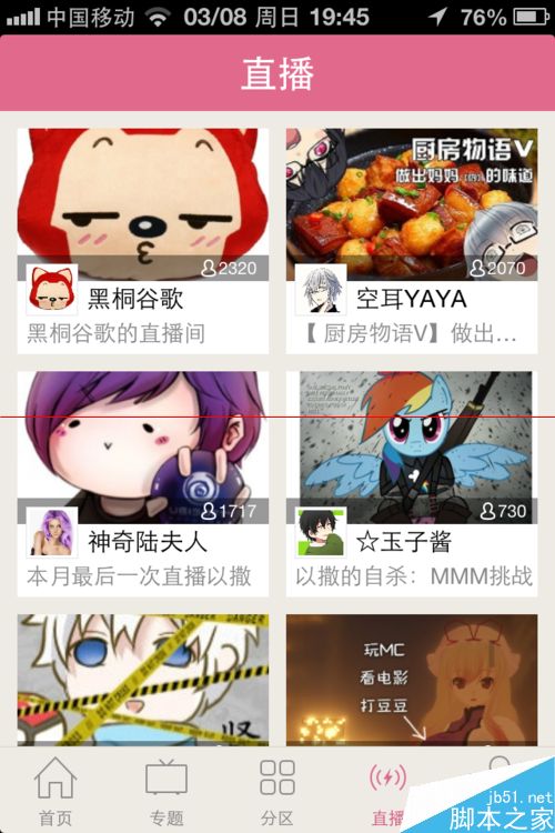 1、找个视频发发弹幕,前提是已经登录哦,我们就来看看黑桐谷歌的直播好了。点击“直播”标签,点击任一直播室。